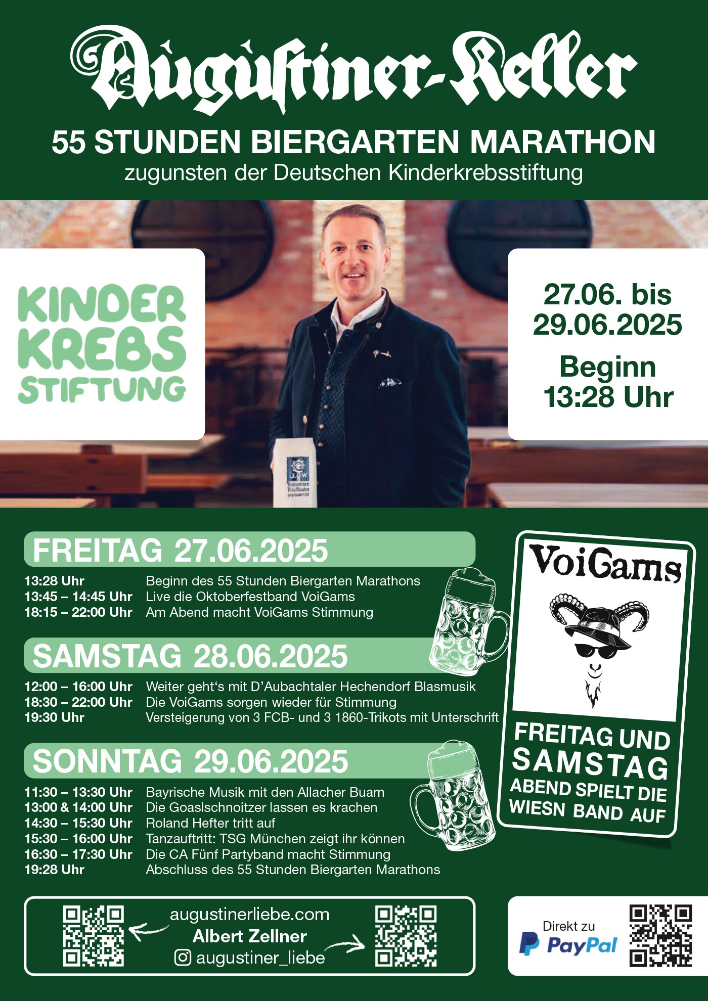 Da hab ich gesehen was dahintersteckt und welche finanziellen Schwierigkeiten es geben kann. Deswegen hab ich gesagt, wir machen einen Biergarten Marathon. In diesem Jahr sitze ich 55 Stunden im Augustiner Keller und werde dort in dieser Zeit Spenden sammeln für die Kinder Krebs Stiftung