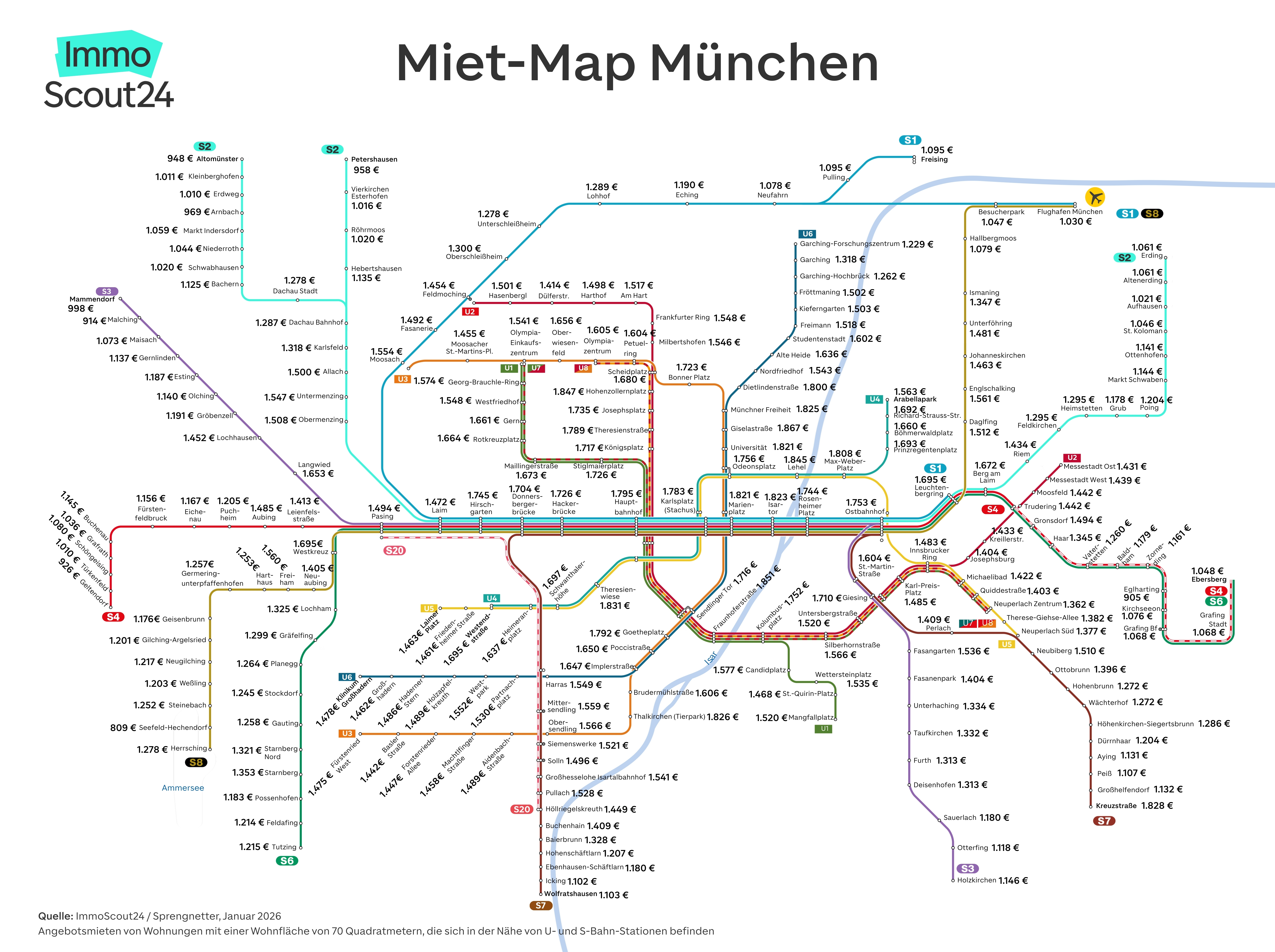 Wer in München eine Wohnung sucht, braucht starke Nerven und ein gut gefülltes Konto. Doch innerhalb der bayerischen Landeshauptstadt klaffen die Preise weit auseinander. Die neue Analyse von ImmoScout24 nimmt die Angebotsmieten für eine 70 Quadratmeter große 2-Zimmer-Wohnung unter die Lupe - und zwar genau dort, wo es für Pendler wichtig ist: an den Stationen von U- und S-Bahn.